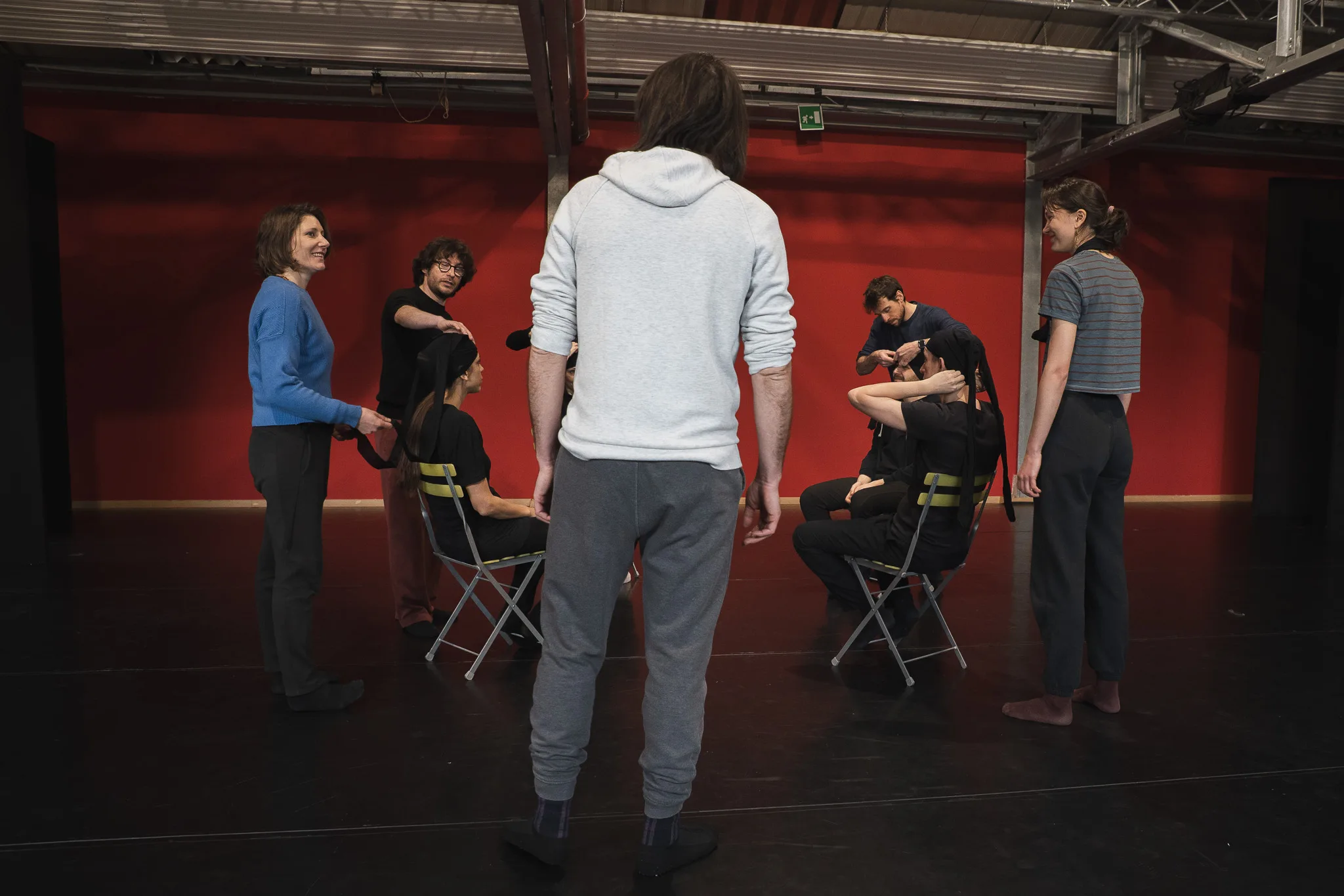 Il laboratorio ha previsto un training incentrato su cinque aspetti particolari dello stare in scena: il respiro, lo sguardo, l'essenzialità, il tempo di reazione e il piacere dell'errore.